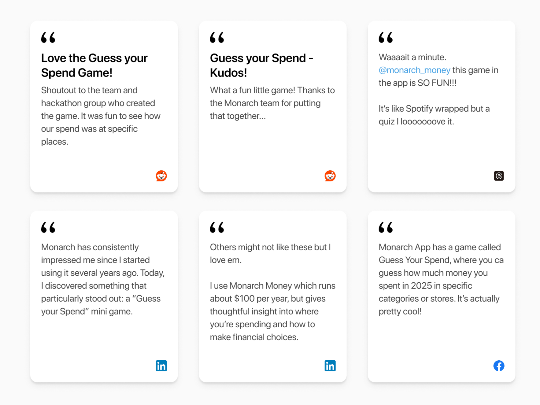 To our surprise, members responded positively to the Guess Your Spend mini‑game. Reviews and comments about the game appeared across several social outlets, including Reddit, Facebook, X, and LinkedIn.