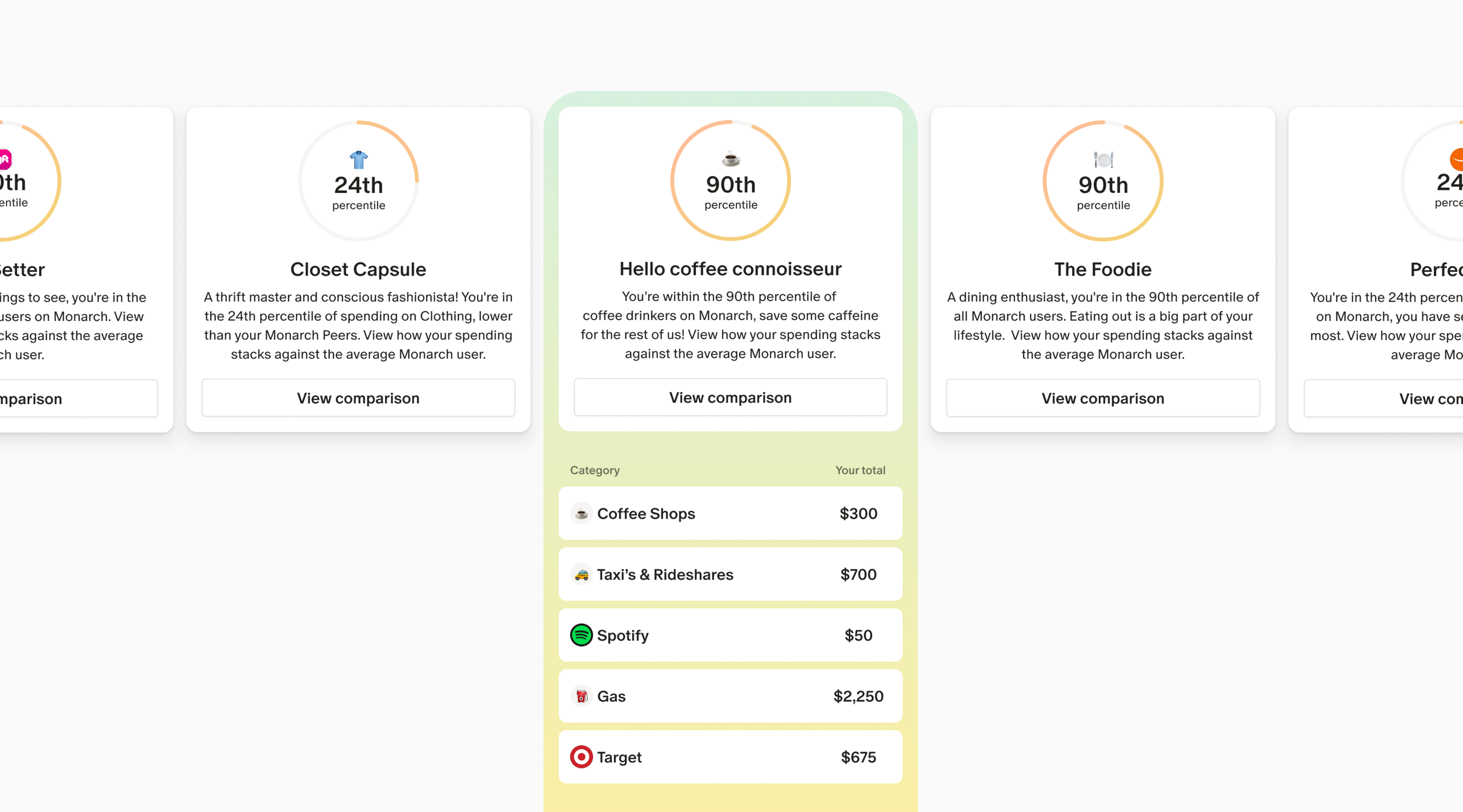 Additionally, a member receives a clear comparison walkthrough that shows how their spending compares to an average Monarch household. We found many Monarch users were curious about how other households and the average household’s financial situations looked, so this comparison flow was designed to satisfy that curiosity in a positive, informative way.